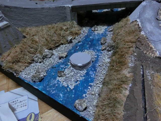 とりあえず河川敷の砂利敷でないところにはこれを貼り付けています。もともとの地面との間に段差が生まれるので、必要なところは紙粘土などを使って埋めています。