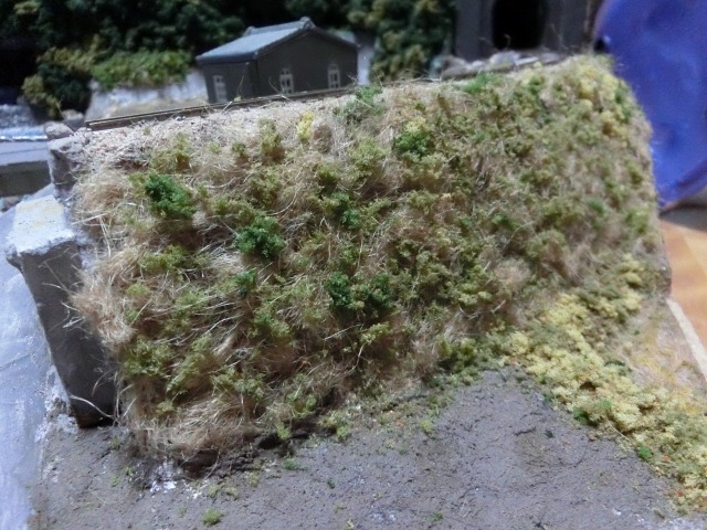 全て麻ヒモで覆った後、KATOのコースターフでそれ以外の草を撒きます。晩秋の想定なので、淡めの緑を多く使っています。
