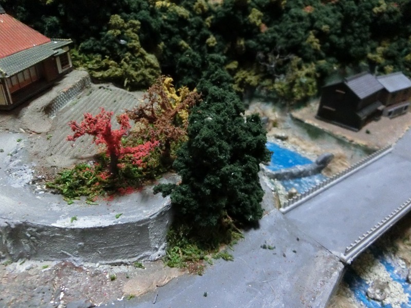 あわせて、クランプフォーリッジで簡易表現した山にも、KATOの紅葉素材をふりかけています。近くで見ると何ともですが、遠くから見ると、まばらに色づく秋の山っぽくて気に入っています。紅葉の表現で一面赤や黄色にしている作例を見ますが、実はそういう山は観光用に整備されたほんの一握りで、実物では針葉樹や常緑広葉樹の中にまばらに色づいているものなのです。