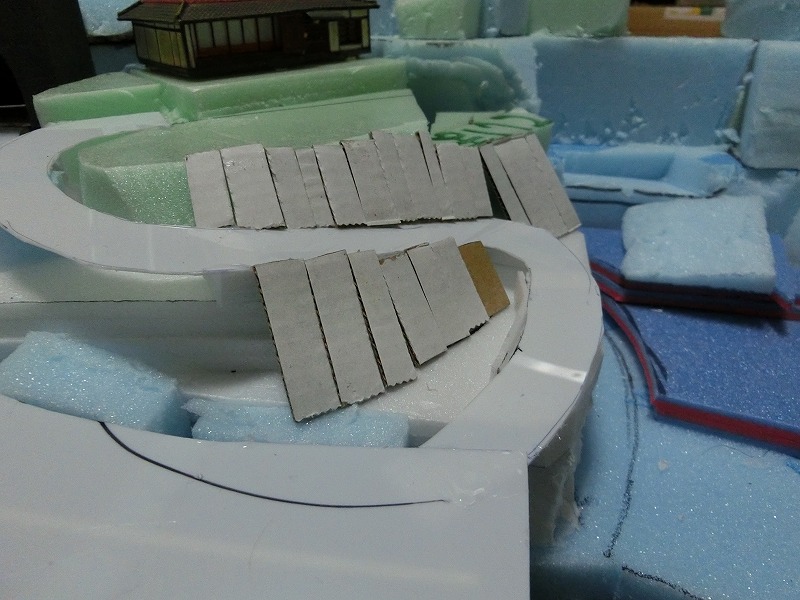 山は取り外しができるように、化粧板を兼ねた板材をこの段階で取り付けています。切込みが入れられているところを取り外すと、線路の整備や脱線の復旧ができるという寸法です。おそらくはそのうちに簡易的な取っ手が取り付けられるはず。