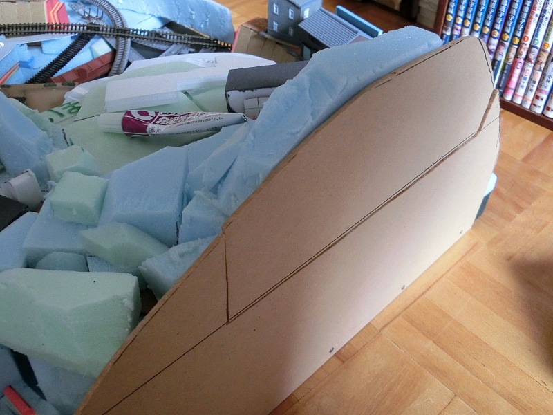 山の形を発泡スチロールでおおまかに製作。このあたりはあとで色々な素材で覆ってしまうので適当です。
