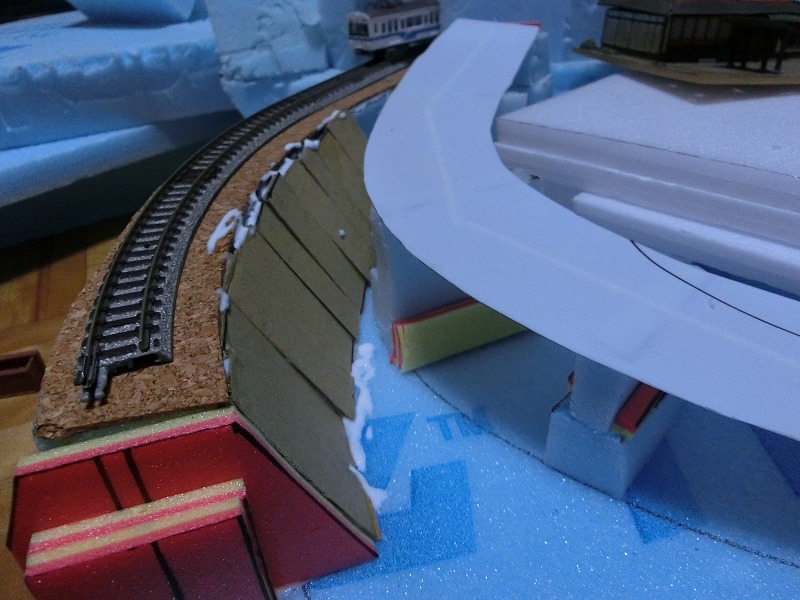 とりあえず築堤になりそうなところは、このダンボール片でフタをしておきました。これだけではデコボコなので、プラスたー作業をするときにきちんと平坦になるように加工します。ボードの関係で斜めにするとはみ出てしまうところは、こちらもプラスター作業をするときに土台のスタイロフォームが見えないようにパテ埋めする予定です。