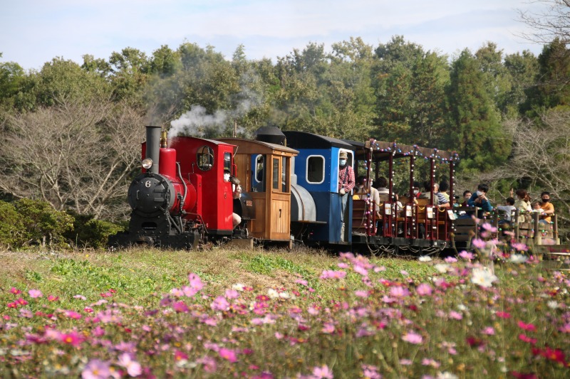 コスモス畑の向こうからやってくる蒸気機関車、わくわくしますね。