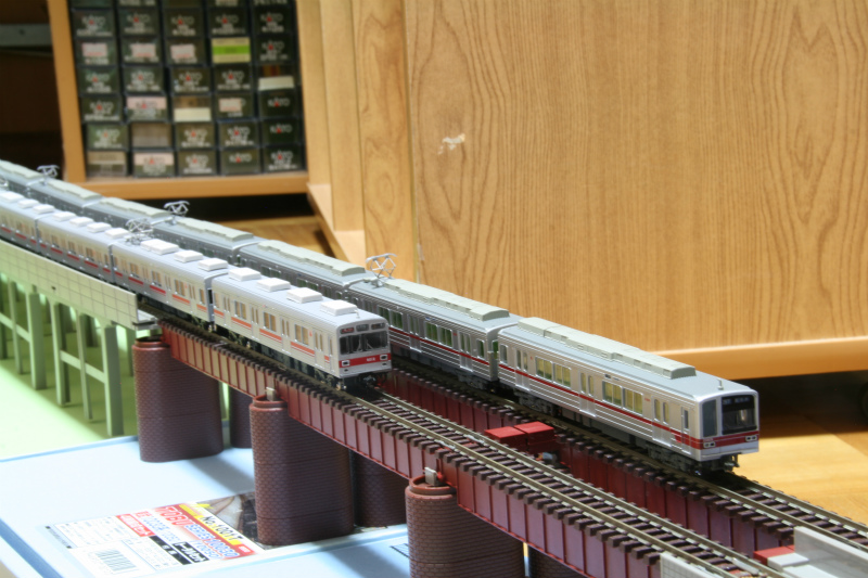 現実の世界では、東武20000系は中目黒から先の東急線内には乗り入れてこなかったので、このようにすれ違う光景は存在しませんでしたが、高架橋の上をすれ違う姿はなかなかいいものです。機会があれば、高架橋のあるレイアウトで走らせてみたいですね。