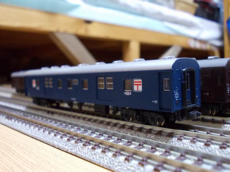 実車は護送郵便車と言って、車内に区分室をなくしたため車内での区分け作業が出来ない代わりに、搭載できる郵便の量を増やした車です。ちなみに区分け作業を行えるオユ10は7t(冷改車)で、こちらは12tです。