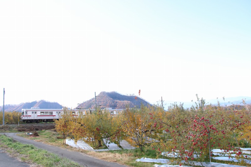 リンゴ畑と3000系、この電車にりんご色の赤帯はとても似合っていると思います。