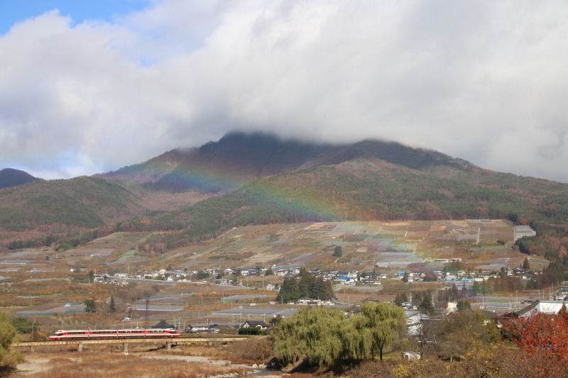 この日は雨ではなかったのですが、一瞬虹が出たのでこれも撮っておきます。強風ではあったので、川の水しぶきが空に上げられたのでしょうか。あいにく3000系が来る頃には虹は消えていました。