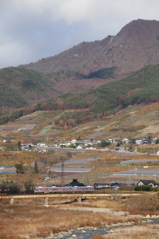 撮影ポイントに到着。夜間瀬川の橋梁、有名ポイントですね。河原に下りたり、電車と同じ高さで撮ったり、視点を変えるといろいろな表情で撮れる楽しいポイントです。
