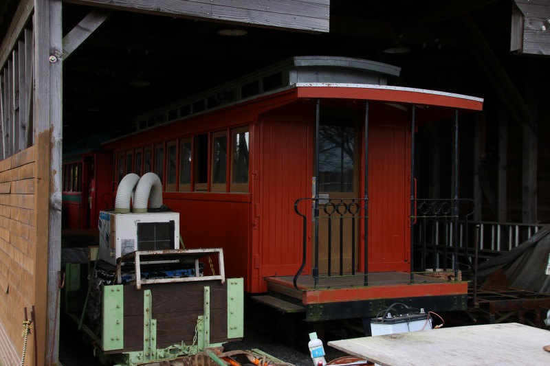 建屋内には様々な車両がレストア待ちで眠っているのですが、その中からこれ、元井笠鉄道の客車が2両あります。大正時代の製造であるはずで、ぜひ乗ってみたい車両ではあるのですが、まだ普段は運転していないようです。