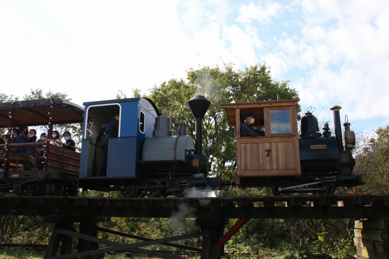 トレッスル橋を渡る6号機、これはメーカー物ですが、昭和15年製造という古典機です。メーカーは楠木製作所。台湾の基隆炭鉱で長く使われた車両を里帰りさせたもので、国内にはこのゆめ牧場にレストア中のもう1機があるのみです。