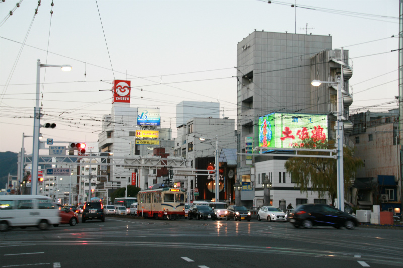 はりまや橋の交差点を600形が行きます。
