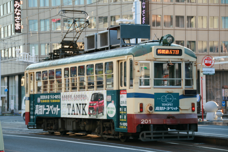 はりまや橋には興味はありませんが、はりまや橋にやってくる電車には興味津々なので引き続きカメラを向けます。最古参の200形の、それもトップナンバーが普通にやってきます。1950年竣工とありますから、2017年現在で車齢は67年ということになりますね。いくら車体更新を行っているといっても、さすがに物持ちがよすぎる気がします(^^;