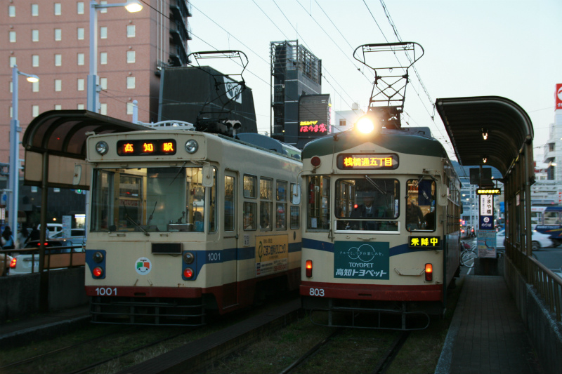 車両にバラエティがないせいであまり注目されない土佐電鉄ですが、主力の600形も1957年製造初年度の吊りかけ駆動でありますし、吊り掛け駆動車が最後まで残るのは、この土佐電鉄のような気がします。もっとも、吊り掛け駆動車が淘汰されるのが先か、路線がなくなるのが先か、という問題も忘れてはいけないところですが・・・。