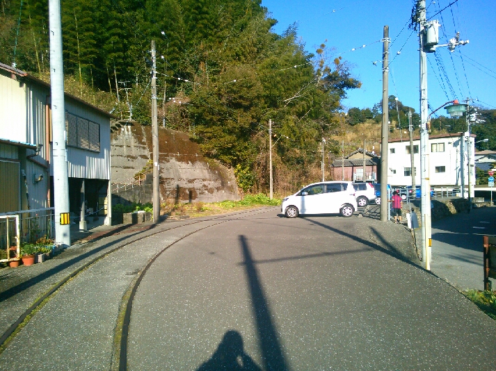 こんな場所に出ます。この場所、かつて伊野車庫と呼ばれた車庫で、現在は廃止されているのですが、写真でわかるようにその痕跡がはっきりと見て取れます。