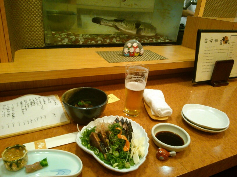 まずはお決まりのビールとカツオで完敗乾杯しております。ちなみに目の前をフグが泳いでいますが、高いばっかりであまり好みではないのでオーダーしていません。言う必要もないかもしれないですが、やっぱり高知のカツオはうまかった。