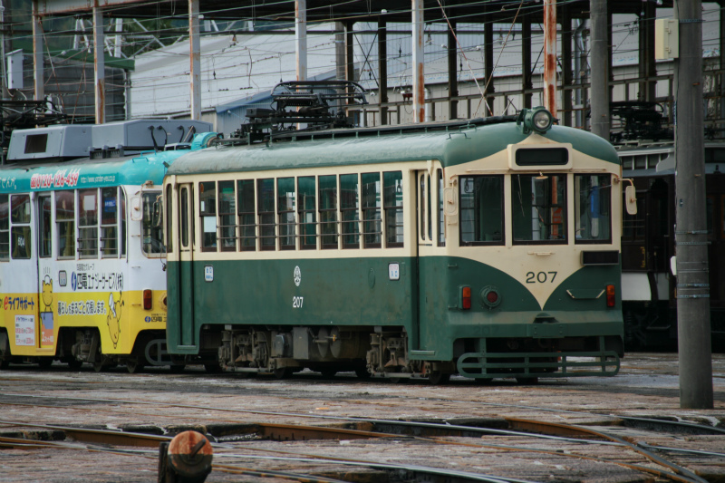 さっそく土佐電の桟橋車庫を除くと、復刻塗装の200形がいました。ご覧のように、冷房装置が乗っていないとかいう、夏場は地獄な車両です。冷房なしの路面電車は阪堺でも乗りました。阪堺は冬場にしか動かないようですが、土佐電はどうなのでしょうね。維新号も向こうに見えますが、こちらは復元車なのでスルー。