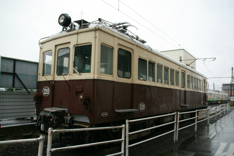 駅を出ると、駅舎のすぐ脇に、まるで展示されるかのように120号が止まっています。これも大正生まれな琴電オリジナルの貴重な車両です。実はもう1両、300号が仏生山で休んでいるはずなのですが、あいにく姿を見かけず。工場の中かと思い工場の周りをウロウロしていると、留置中の車両の奥に床下だけチラリと発見。なんてこったい。