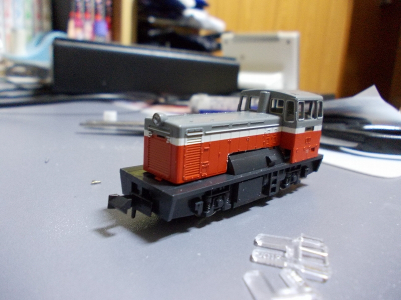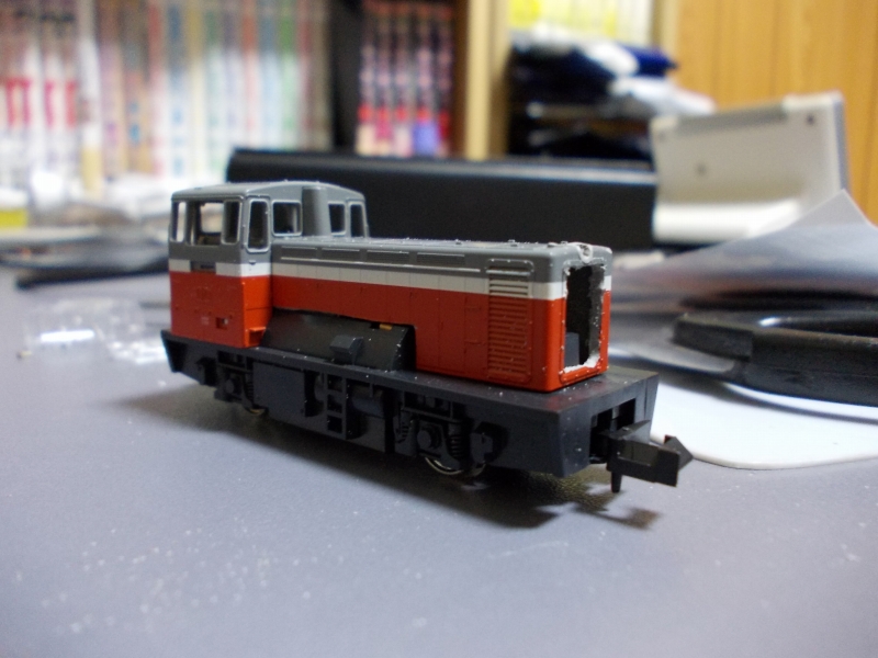 動力ユニットに車体をかぶせると少し車体が短いような気もしましたが、製品の窓のHゴムを生かしたかったのと、セミセンターキャブのスイッチャーなどという特殊事例は避けたかったこともあり、片方のボンネットを完全に切り落とした形になっています。