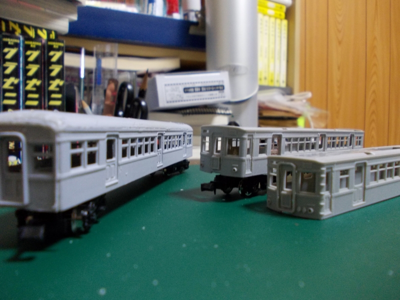 こうやって書くと大げさなようですが、クモハはそのままですし、クハもタヴァサの改造パーツを使って一番前のドアを交換しただけです。ちなみにベースは、後ろにも箱が見えているようにリトルジャパンのキットです。