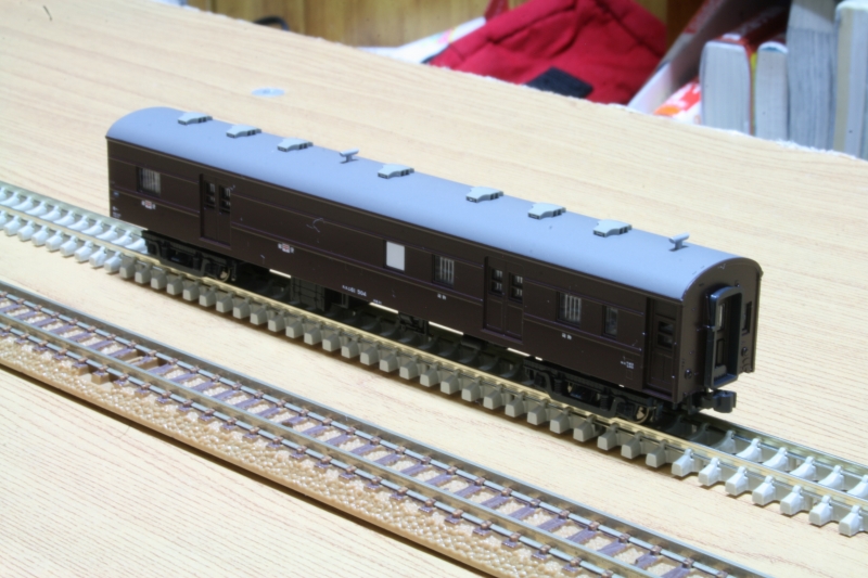 郵便・荷物の合造車で、茶色の客車でありながら既発売のマニ60やマニ36とは違って、郵便を積む部分の窓がふさがれているのが楽しいですね。荷物列車の中に1両入っていたらアクセントになりそうな車両です。