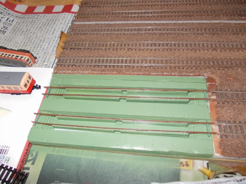 厳密に言えば、ピットは地面レベルではなく、線路が埋まるように一段高いレベルで基礎を作らなければならないのですが、それをやるには更にプラ板を切って貼っての工作が続きますので、面倒だったので雰囲気は十分だと思いこれで止めることにしました。自分的にはこれで満足です。