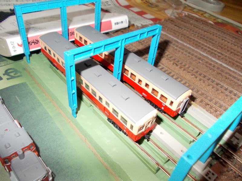 つたない写真ですが、車両を入れてみました。工作している最中に撮ったため周りがゴチャゴチャしているのはお目こぼしくださいませ。