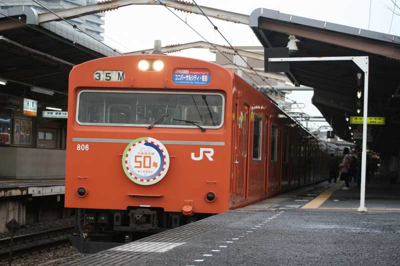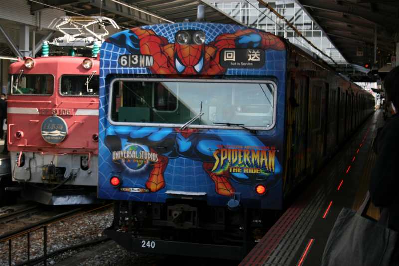 隣にはUSJに直通する桜島線用の103系が入線してきました。それにしてもドギツイ塗装ですね(^^;