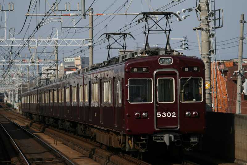 力走する5300系。阪急の車両を撮っていて思うのは、先頭車がダブルパンタのためタイミングがつかみにくいこと。かつて京王6000系を撮ったときにも同じようなことがあったのを思い出しました。