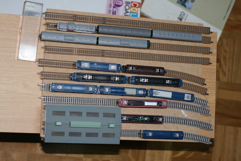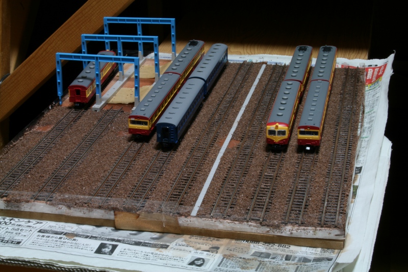 左上の車庫部分は、KATOの電車庫の骨組みです。そこにはまだバラストどころか線路さえ敷かれていませんが、ちょっとしたお遊びを考えているので先に車庫外の部分を進めてしまうことにしています。