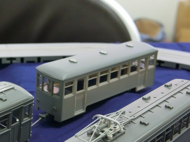 何といってもサプライズは、猫屋線の電化でしょう。イメージ元は福島交通軌道線。細身な体と小さな図体がかわいらしいですね。乗っているのはHO用の小型パンタグラフ(名鉄モ510用のもの)ですが、ナローの小さな車体には大柄に見えてとてもベストマッチだから不思議です。動力も鉄コレの機関車用のものなので、走行性能も担保されていますね。