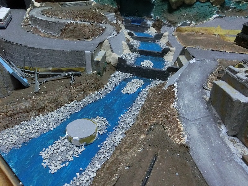 中流域という設定ですから、滝のように一気に水が落ちるのもおかしい話です。そこで、砂防ダム……のようなものを作りました。のようなもの、と但し書きをしたのは、この構造ではおそらく砂防ダムとして機能しないと考えられるためです。まあ、こういうのは伝わればいいのです。伝われば(強引