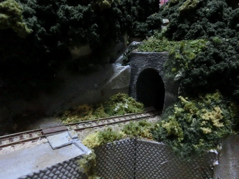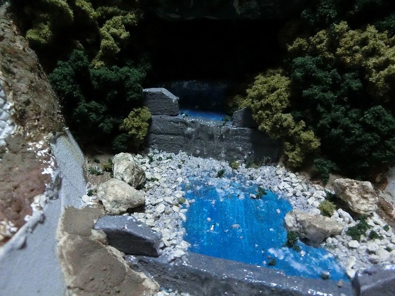 普通、ジオラマに川を作る場合は川がジオラマの外から流れてきて、ジオラマを通り、ジオラマの外に流れ出すという構造になるわけですが、それが不可能な場合、どうにかして川の起終点を隠してやる必要があるわけです。