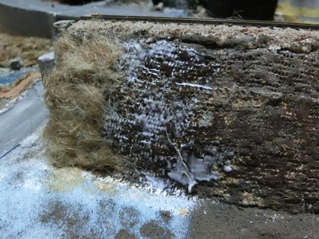 全て麻ヒモで覆った後、KATOのコースターフでそれ以外の草を撒きます。晩秋の想定なので、淡めの緑を多く使っています。