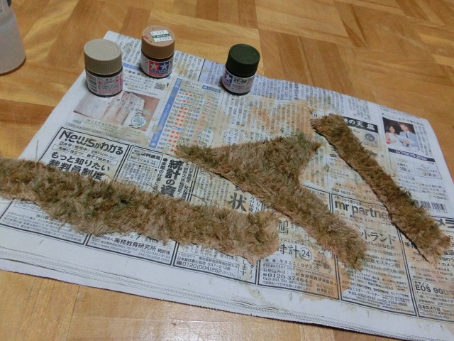 任意の大きさに切り出し(切り出しには一度古新聞などで型取りするのが簡単です)たら、水性アクリルで染めていきます。今回はMrカラーでもいいはずですが、今回はタミヤのバフ、オリーブグリーン、デザートイエローを使いました。薄め液は半分くらい入れて希釈しています。