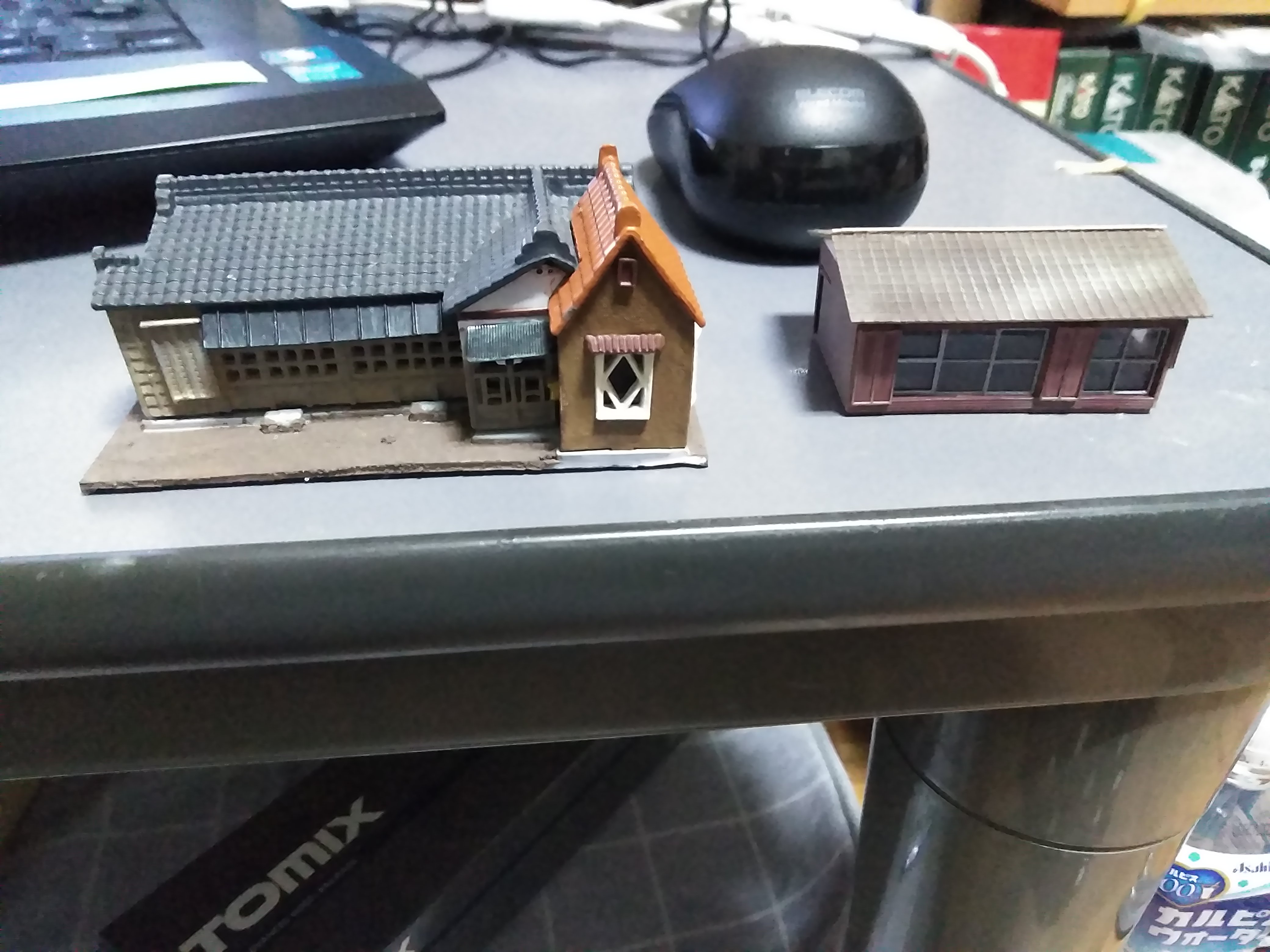 本来ならもうすこし「みすぼらしい」家が理想なんですが、こういう田舎のどこにでもありあそうな家ってのはこれくらいしか製品がないんですよね。あとはKATOの鉄道官舎キットくらいしかないですが、あれも社宅感が出すぎてしまってダメ。自作も考えましたがしかし、当初のコンセプトは「建物の自作をしない」です。理由はそうすると面倒くさくなって完成しなくなるから。完成させて遊ぶのが目的なので、妥協して完成させるつもりでした。