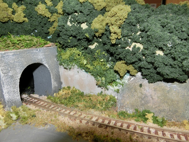 山のハゲが気になるので、そこは後で直すとして、通称「裏側」セクションの線路わきに草を撒きました。お決まりのKATO扱いの草素材です。同時に、トンネルや石垣にもウェザリングを施しました。主にパステルの白をすり込むようにして汚しています。