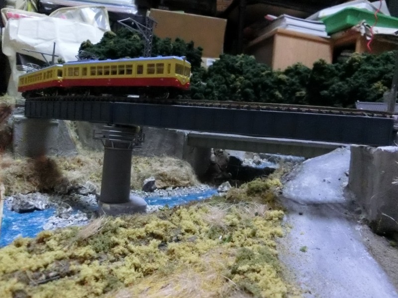 ジオラマの鉄則として想定される視線の手前から奥に向かって高低差をつけるのがダイナミックに見える秘訣だと様々なところで紹介されており、製作中のレイアウトでもそのようになっています。ただ、製作スペースが小さい関係で現実世界以上にその高低差がダイナミックにならざるを得なくなっていて、川の上流部から下流部の高さも相当なものになってしまっています。橋梁部分で橋から水面までの充分な高さを確保しなければならないという事情もあります。