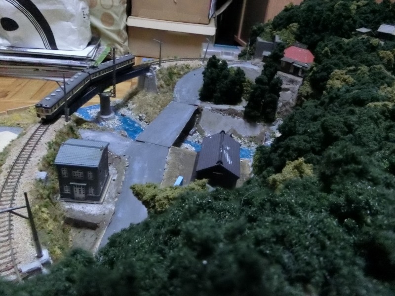 その代表的な妥結点が、湖や沼などの水のたまり場所を作ってやったり、暗渠を作って物理的に隠してしまったりするわけです。今回はそういったものはレイアウトの構造上採用できず、苦しい処理ですが、レイアウトにおける川の起点を森の暗がりで隠してしまうことにしました。砂防ダムも川の起点を隠すための仕掛けの一つです。自然の構造物としては不自然ですが、これ以上やりようもないかなということで、とりあえずいい案が浮かぶまではそのままです。