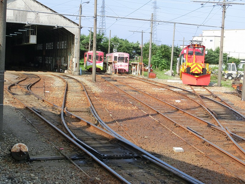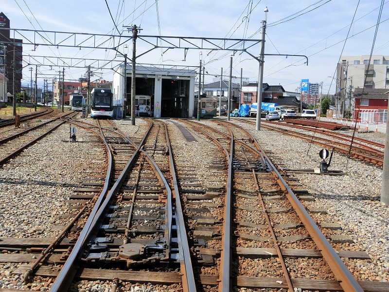 稲荷町の車庫、広大な路線網を持つ富山地鉄の車庫だけあって、並みの地方私鉄の車庫ではありません。東急池上線の雪が谷大塚よりたぶん立派ですw 軌道線の車両の全検もやっているようなので、さもありなんというところですが。