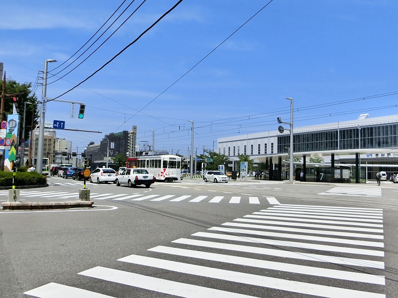 せっかくなので市内線で富山駅へ戻ります。路面電車が見えていますが、これが富山駅の構内にまで入っていきます。電車を降りたら歩いてすぐで改札口という寸法です。これはかなり便利でした。そのうえ、駅の向こう側で発着する富山ライトレールにも接続できるように工事をしていました。写真の右に見えるバスターミナルと合わせ、すべての公共交通がひとつの駅前で完結する(これからなる)富山駅、素晴らしい駅であると思いました。