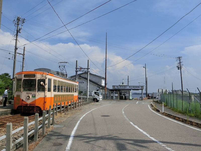 かつてはこの先にも富山地方鉄道射水線の線路が伸びていて、このまま乗っていると富山市内線まで乗り入れることができましたが、富山湾の改修工事で廃線に。今は渡船で対岸に連絡しています。