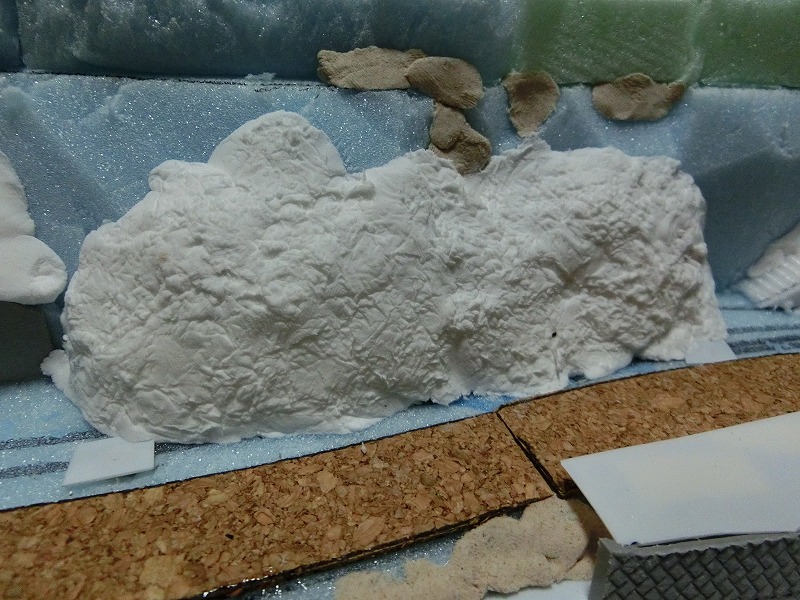 さらに山のベースも製作していきます。つまようじに刺したスタイロフォーム片を山に刺して固定します。といっても、これではなんだかわかりませんね。