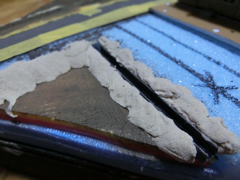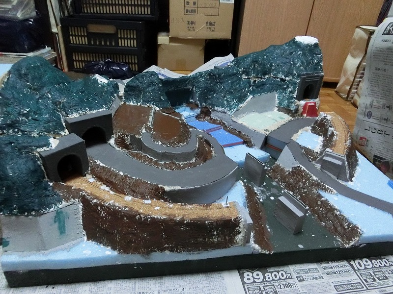 なお、この斜面に限らず茶色のポスターカラーを塗ったところには、ターナーのグレインペイント(生産やめちゃったらしいですね)の黄土を水性アクリル薄め液でシャバシャバに溶いたものを流して、色味を落ち着かせています。