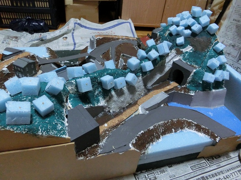 岩も製作。紙粘土に丸めたアルミホイルを押し当てて作るお手軽なやつです。塗装もしましたが撮るのを忘れた。