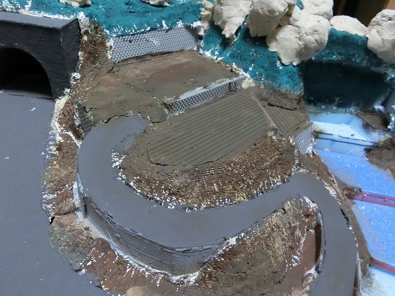 ちょっと見えづらいですが、いつも掲載しているのとは反対側のエリア(通称:裏側)のトンネル横に通路を作って階段で山に上がれるようにしました。こちら側にはストラクチャーがなく、線路の向こう側に山しかないという寂しいものだったので、奥行きを持たせるため、無理やりですが線路の向こう側に歩いてだけ渡れるように構造物を作ることにしました。