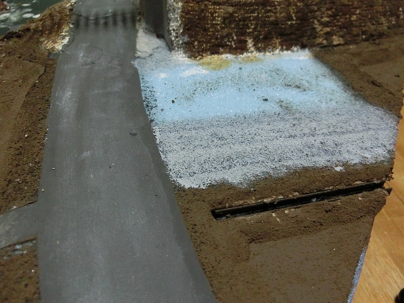 右側の砂利道は、まずアクリル絵の具のグレーでスタイロフォームに直塗りし、その上から仏壇用の灰をすり込むようにして撒き、テクスチャーペイントやアクリル絵の具でニュアンスをつけています。おそらく轍になるように、車のタイヤの跡だけが砂利として露出し、それ以外のところには草が生えるようにするはずです。