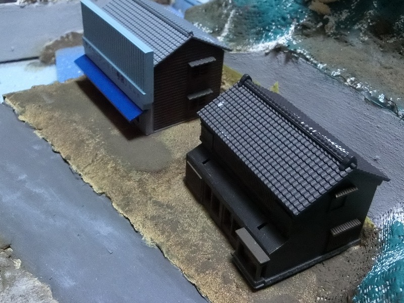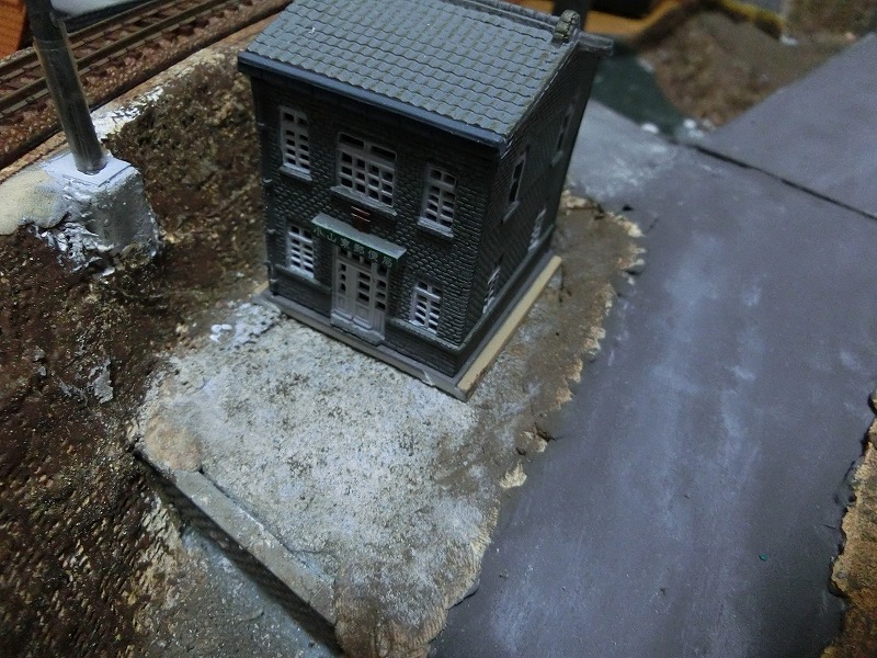 先ほどからちらちら見えていましたが、道路はポポンデッタの道路用グレーです。ここにアクリル絵の具のグレーをドライブラシしたり、仏壇の線香を入れる灰をすり込んだりしてウェザリングしています。
