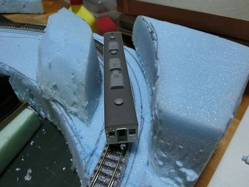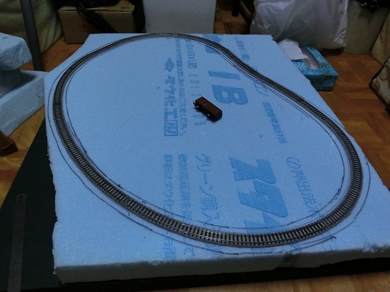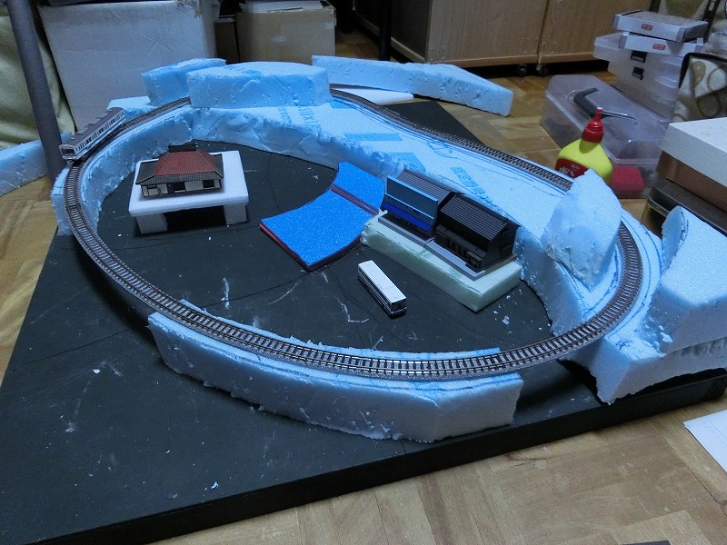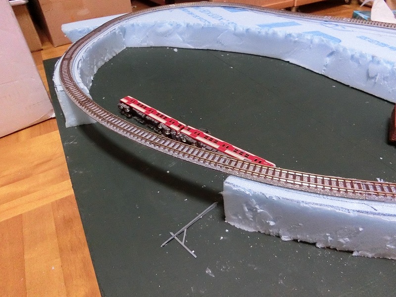 ちなみに一部スタイロフォームが削れていますが、このスタイロフォームが作りかけて壊した以前のレイアウトの夢のあとだからです。今回は見せられる程度には完成に持ち込みたいのですが。。。