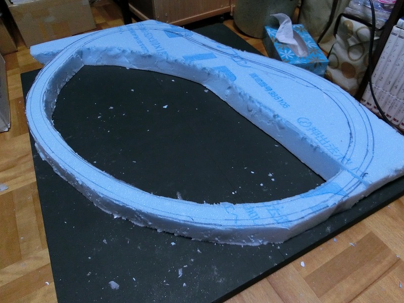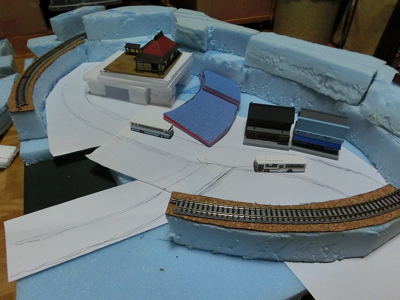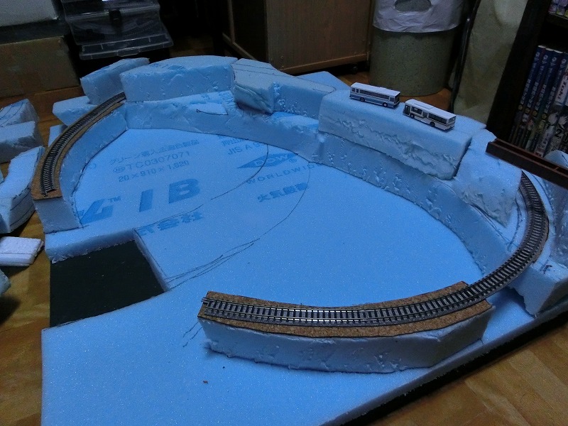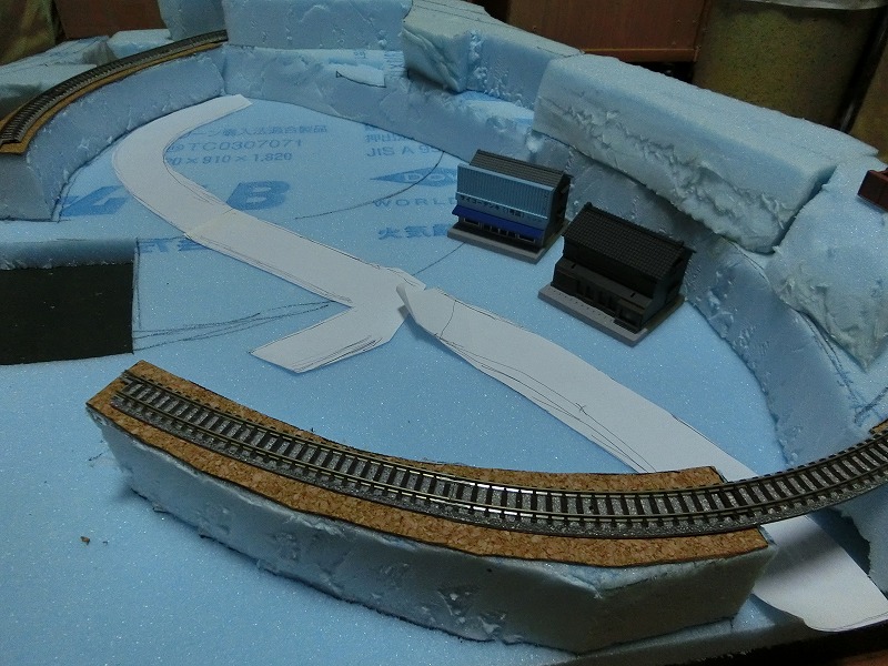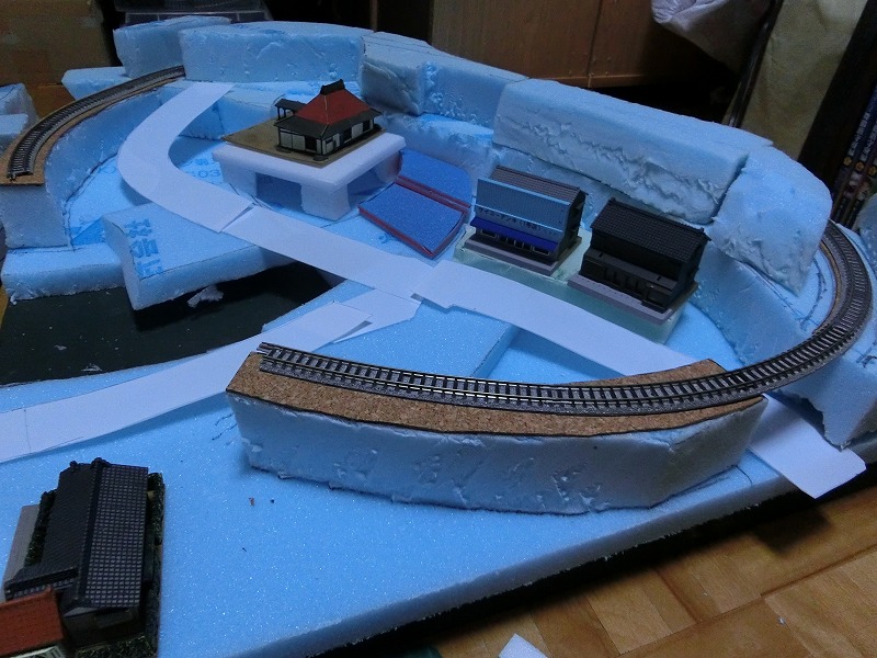 実際に製作に入るわけですが、例によってレイアウトの大まかな形はスタイロフォームの切り貼りによって作ります。このあたりは語りつくされているので、特段コメントもないですね。