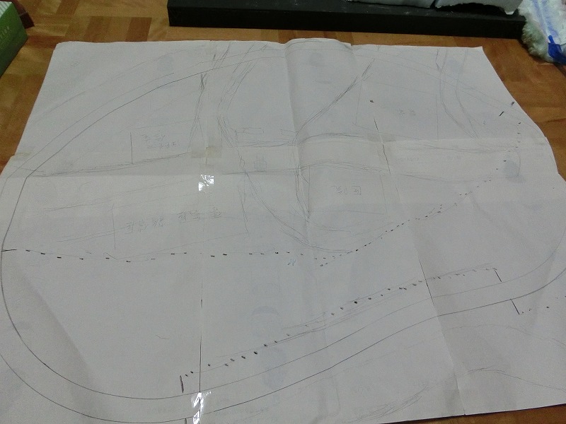 レイアウトを検討するときは当然紙の上でやるわけですが、このように実寸で計画できるんですね。大きいレイアウトでは大きすぎてこうはいきません。これによって実際にストラクチャーなどを置いてみる事で、イメージがわきやすいような気がします。